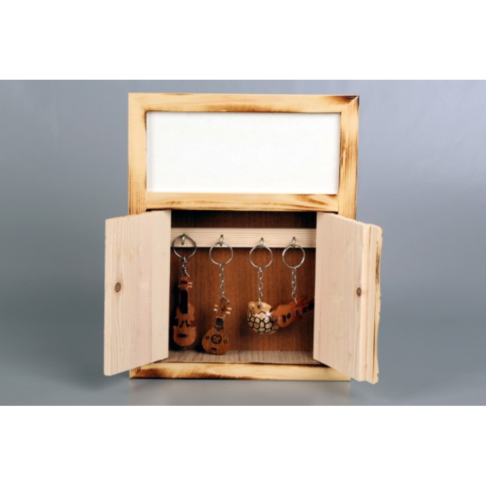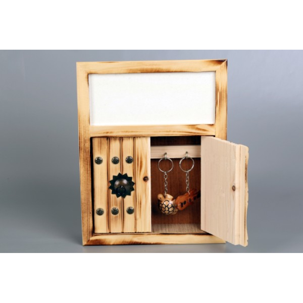 Een bijzondere handgemaakte houten sleutelkast. De sleutelkast is 28cm x 22 cm groot en heeft een schrijfoppervlak van 18 x 7,5cm.